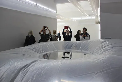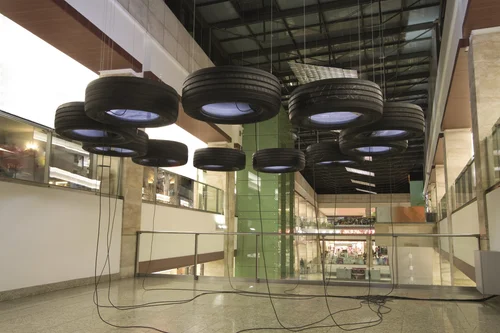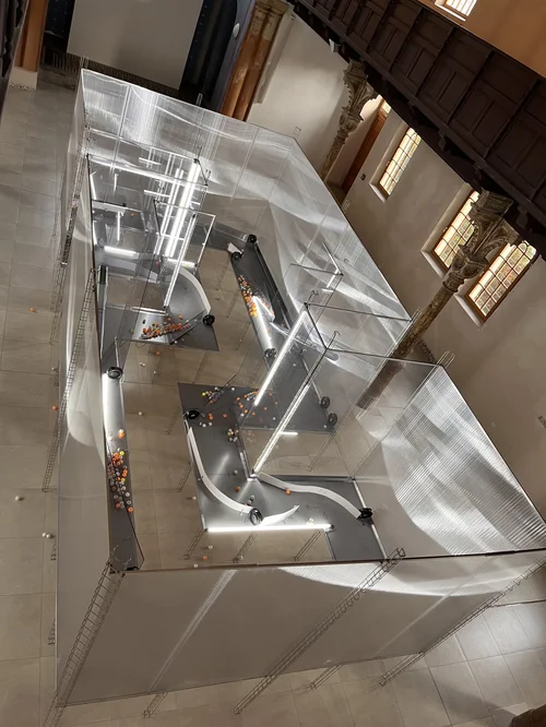 Szilárd Cseke’s dominant interactive installation is a visual allusion to the unremitting flow of civilisation, the evolutionary “machinery” of life including its heroes and trendsetters, and also its dissenters. Dynamic, in places clamorous, industrial movement, as a metaphor of existence, may be decelerated and refined by leaving one’s own message on one of the pingpong balls. The universal situation thus becomes exceptionally human.